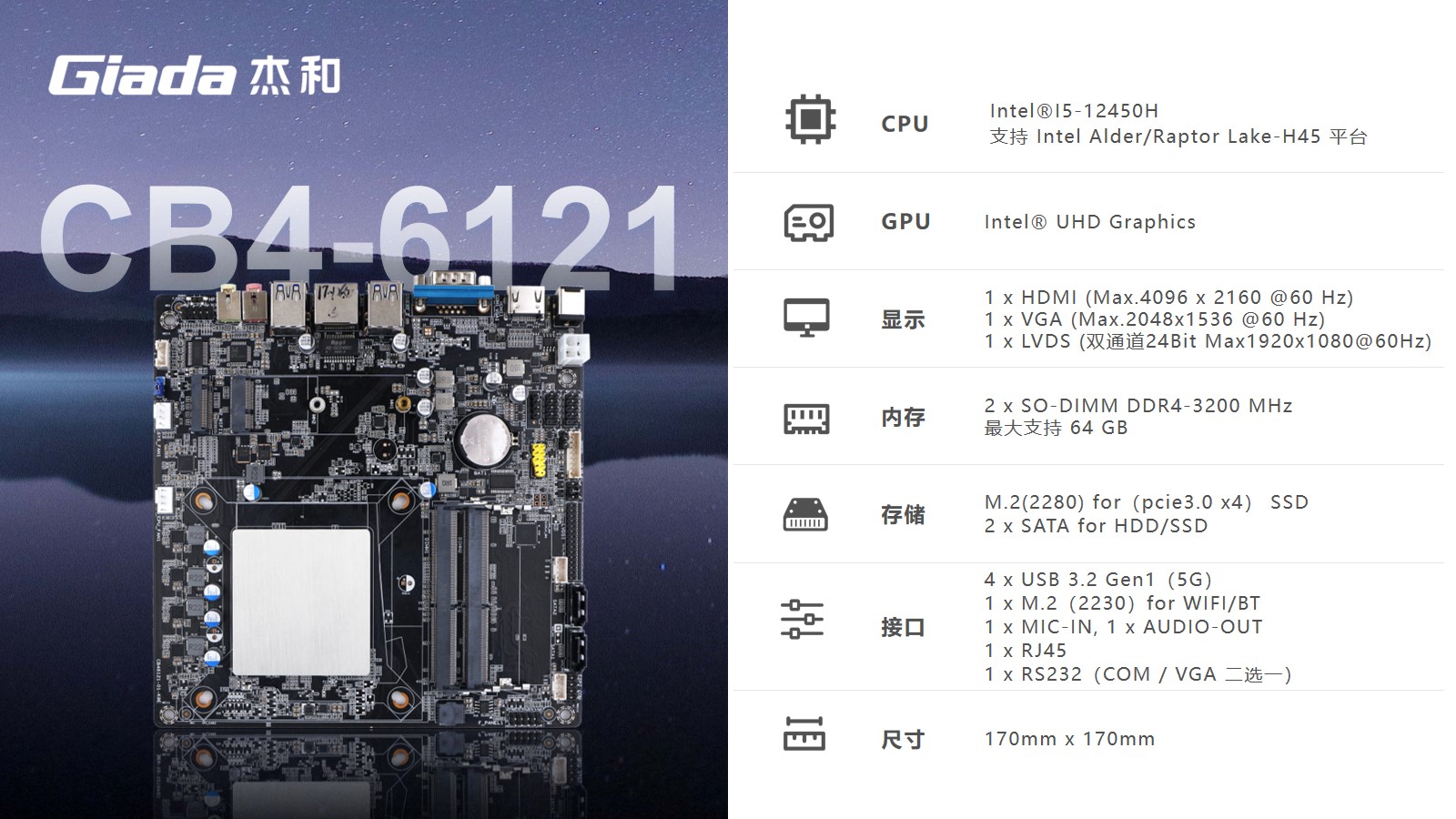 CB4-6121主板采用了170*170mm Thin mini-ITX版型设计,致力于打造更加紧凑和精致的外观,这种规格常用于一体机设计。