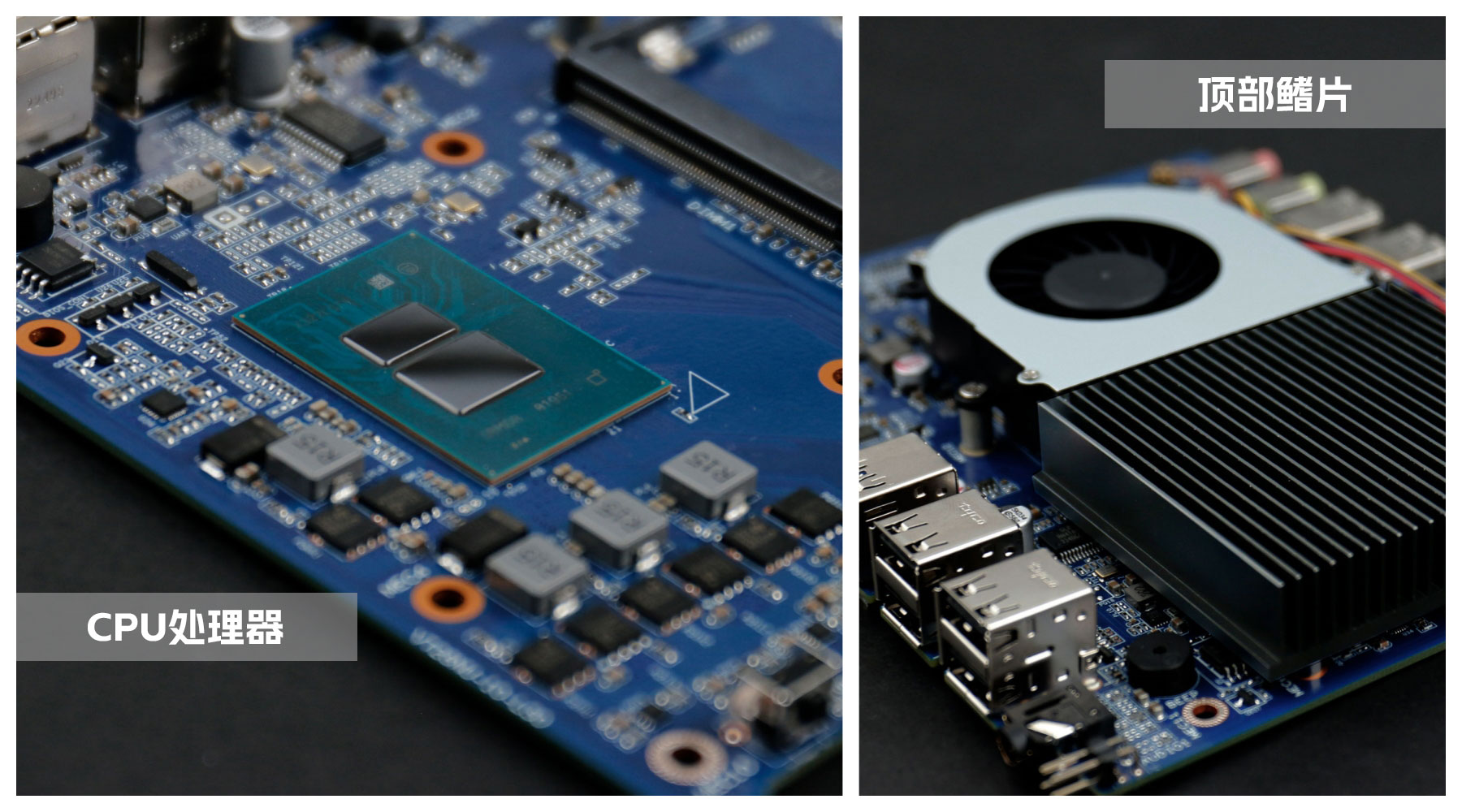 主板是球盟会·QMH桌面云终端Y-BOX S2的核心部件,拆开主板上的顶部铝制鳍片与风扇,整体配色是常规的深蓝色,由球盟会·QMH自有工厂倾力打造,CPU采用板贴的形式,表面涂了一层散热膏用于导热,可以支持intel新一代Alder Lake-N平台处理器,为英特尔首款基于 7nm 的产品线,最高可支持到8核,采用大小核(E核、P核)的全新架构,在同等功耗下有更优异的性能表现。