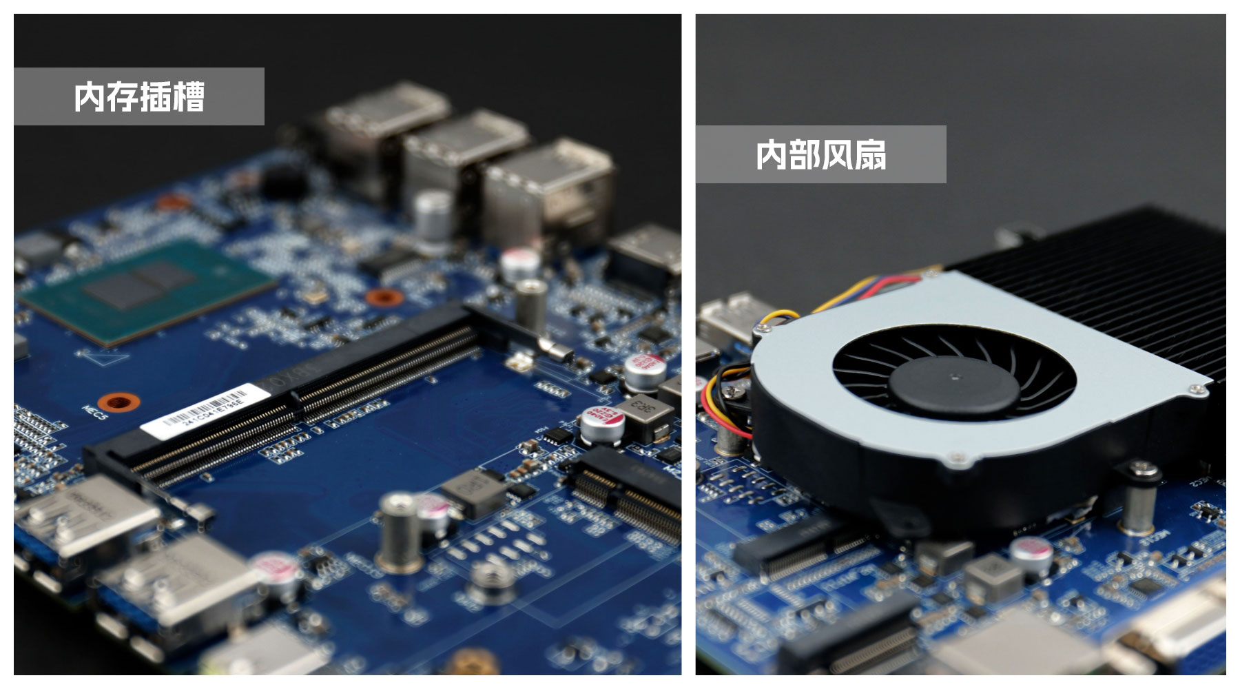球盟会·QMH桌面云终端Y-BOX S2主板中部是内存插槽,采用单通道笔记本内存槽设计,最大支持容量可达32GB,最高支持DDR4-3200MHz频率,横插的形式可以减少主板的占用体积,使整体机身更紧凑,内存顶部的风扇起到高效散热的作用。