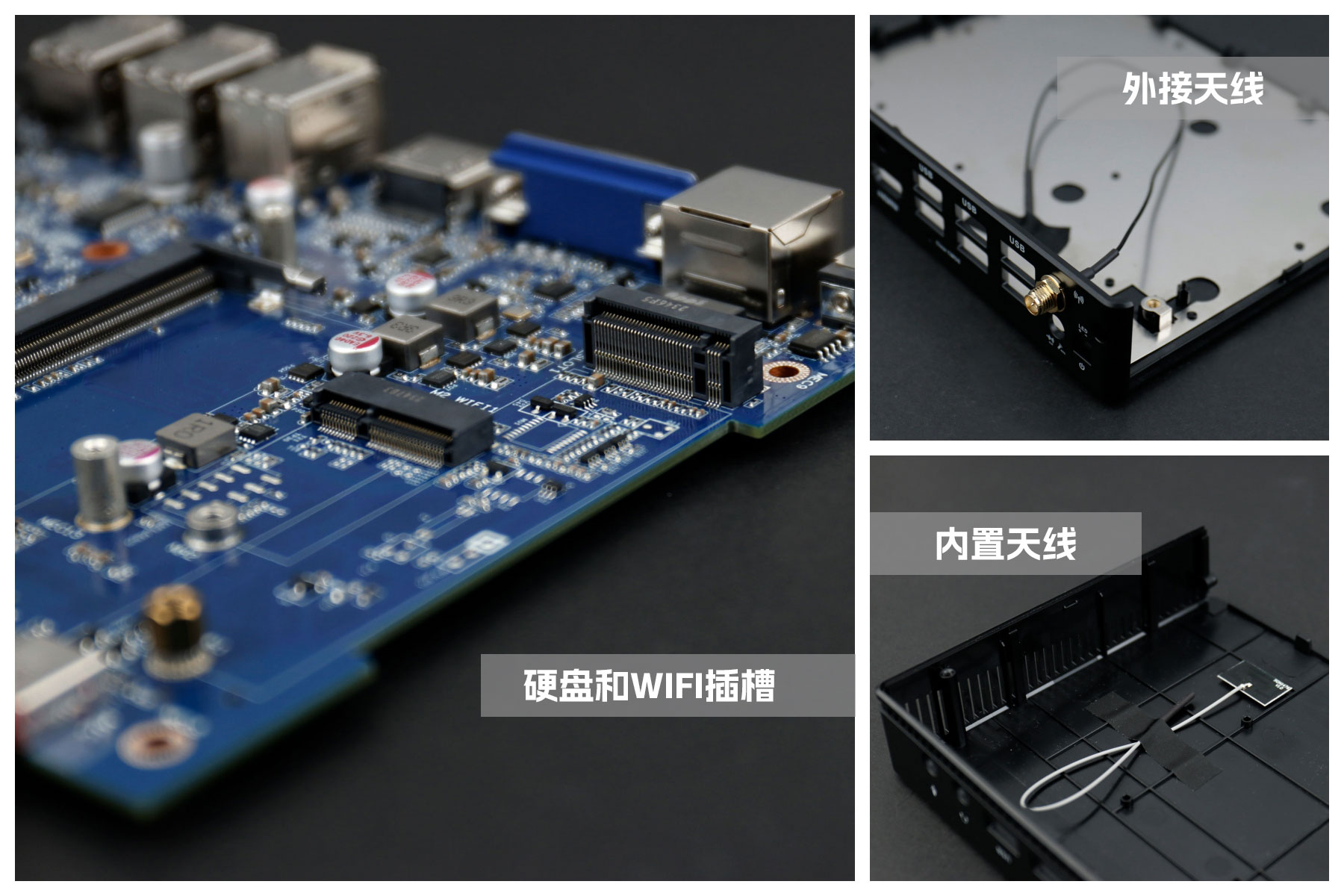 球盟会·QMH桌面云终端Y-BOX S2主板上配备了 1个 M.2 固态硬盘位,接口规格为 PCIe3.0 标准,匹配标准的 2280 规格硬盘。一侧还有一个M.2接口,匹配2230长度的WIFI/BT模块插槽,WiFi模块可以连接的是外接天线,增强信号,同时也可以内接天线,灵活应用,支持Wi-Fi 5/6/6E网络。