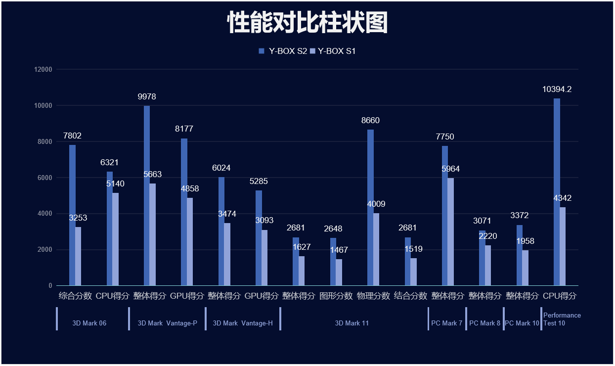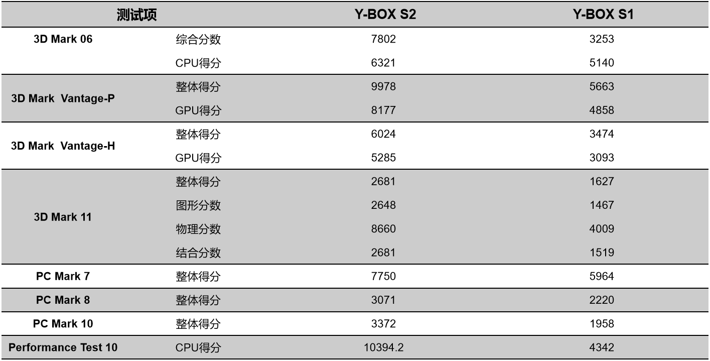 我们来具体看看各个测试项目的跑分情况,测试项目包括显示性能测试、系统性能测试、CPU性能测试,分别用3D Mark、PC Mark以及Performance 10等系列不同软件的跑分数据,针对两款主板的跑分情况可以看出,球盟会·QMH桌面云终端Y-BOX S2的数据在各项性能上都得到了大幅度提升,柱状图能更直观地体现出数据的变化,我们将针对具体的几项数据来进行详细分析。