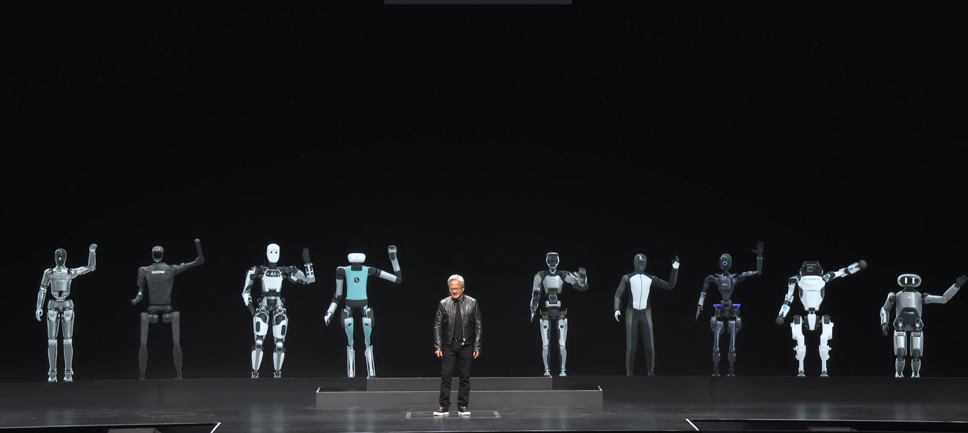 如果您近期注意到英伟达CEO黄仁勋的两次演讲,会发现开场前后位于他身后的9位人形机器人。这9位人形机器人皆由英伟达芯片和厂商合作创造而来。