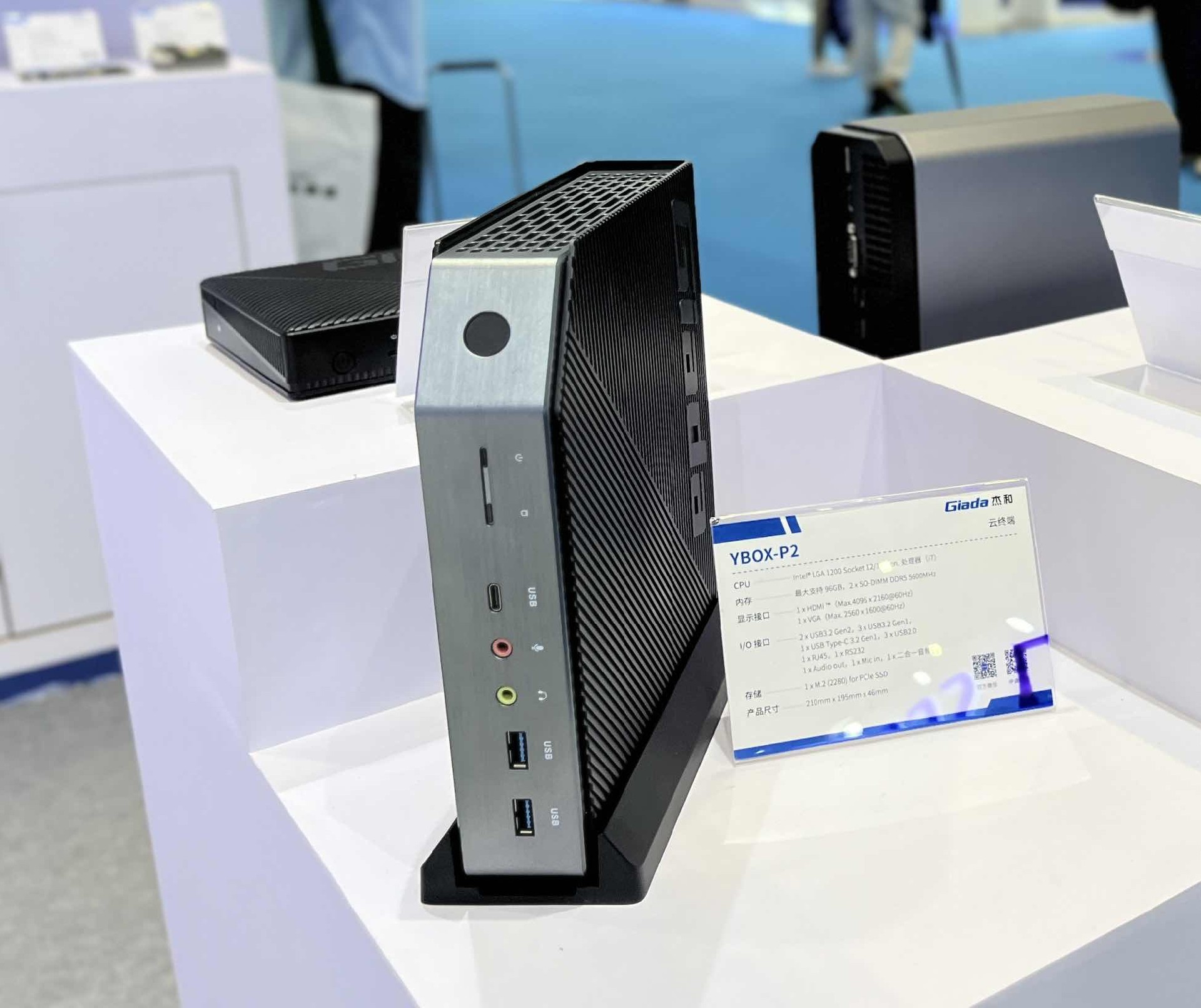 球盟会·QMH科技云终端是云桌面解决方案的重要产品之一,此次我们针对各客户群体提供不同架构的云终端,带来YBOX-P2、YBOX- S1、Y-BOX- S2和YBOX- SA1四款产品。其小巧的体积吸引了许多观众前来咨询,最新推出的YBOX-P2以其工业感造型以及卓越性能脱颖而出,YBOX-P2支持Intel® LGA 1200插槽,兼容12/13代处理器,在内存配置上同样出色,最大可扩展至96GB,支持2 x SO-DIMM DDR5内存插槽,频率高达5600MHz,确保数据处理速度和多任务处理能力满足高标准需求。