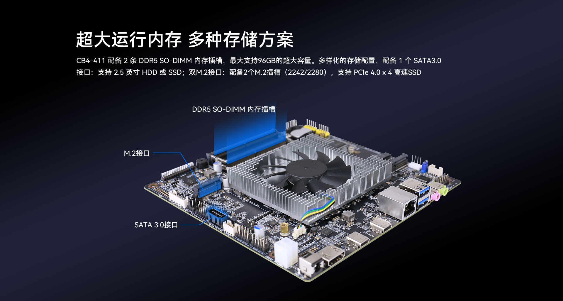 在内存方面,CB4-411主板具备强大的性能,采用DDR5内存,最大支持容量96GB,满足各种复杂应用场景的需要,充分满足用户需求。