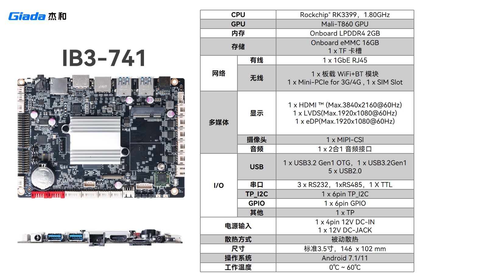 IB3-721同样采用 RK3288 处理器,通过精简接口进一步控制成本:保留 1GbE RJ45 网口,删减 RJ12 ,USB 减至 5 个、TTL 串口减为 3 个 ,在满足基础商显交互(如零售机、查询机)同时,降低成本,适配功能聚焦、对成本敏感场景 。