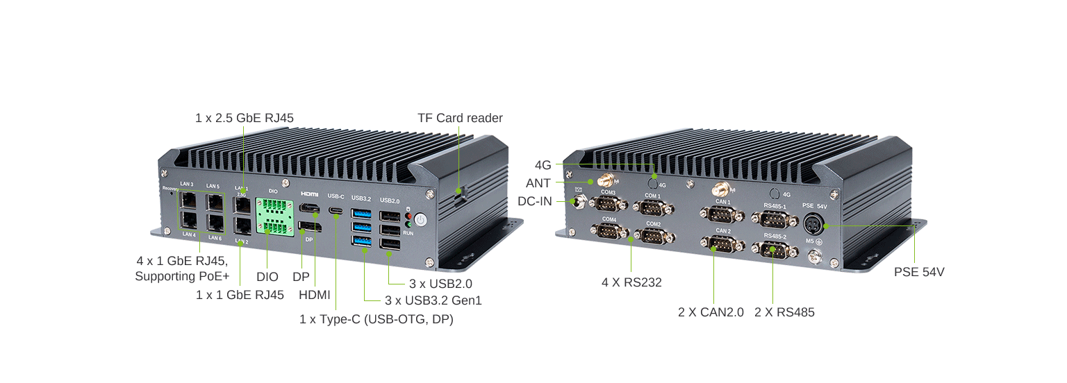 丰富接口适配:配备 RS485、CAN、HDMI™、LVDS、USB、网口、DI、DO 等多样 I/O 接口,能满足多设备连接需求,为机器人功能扩展与系统集成提供便利。