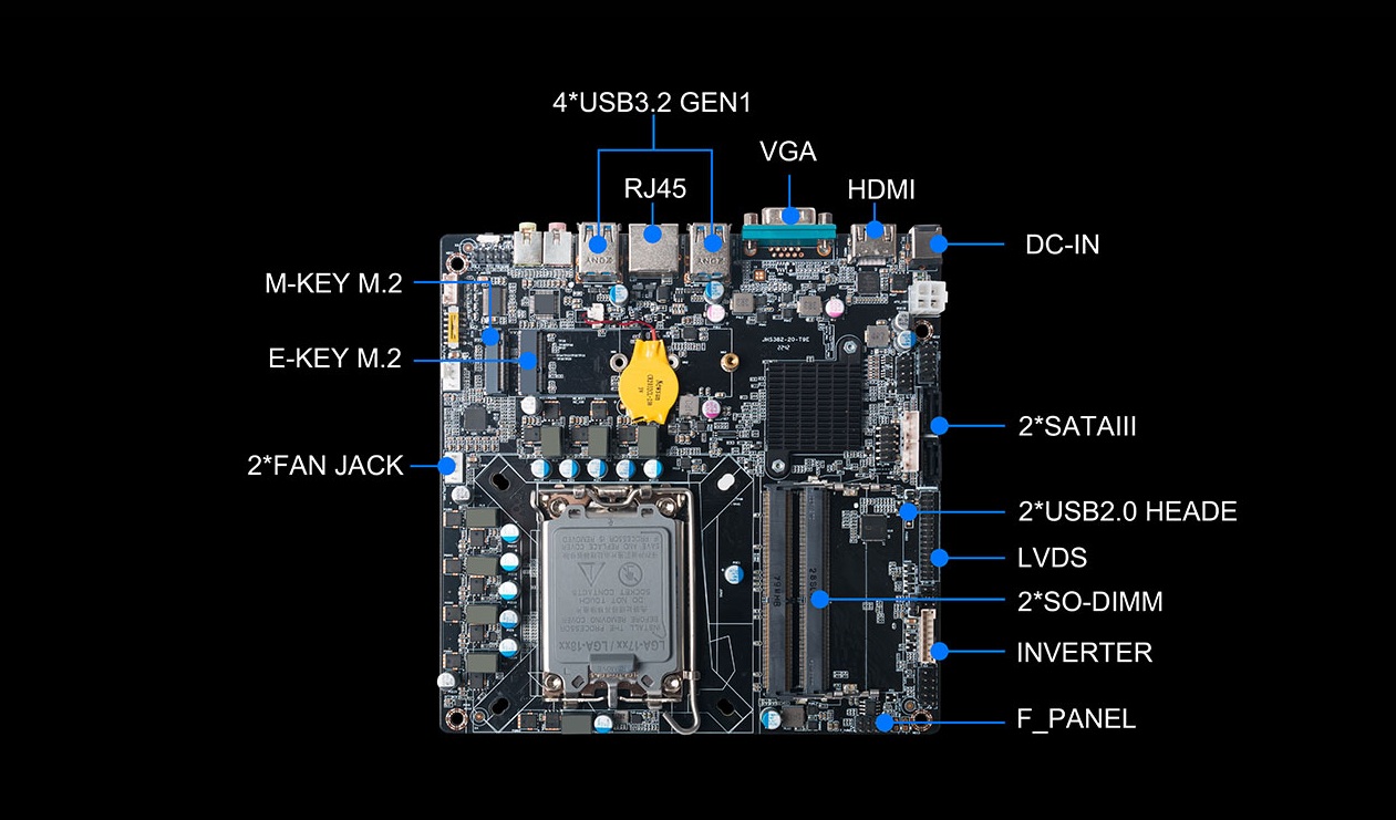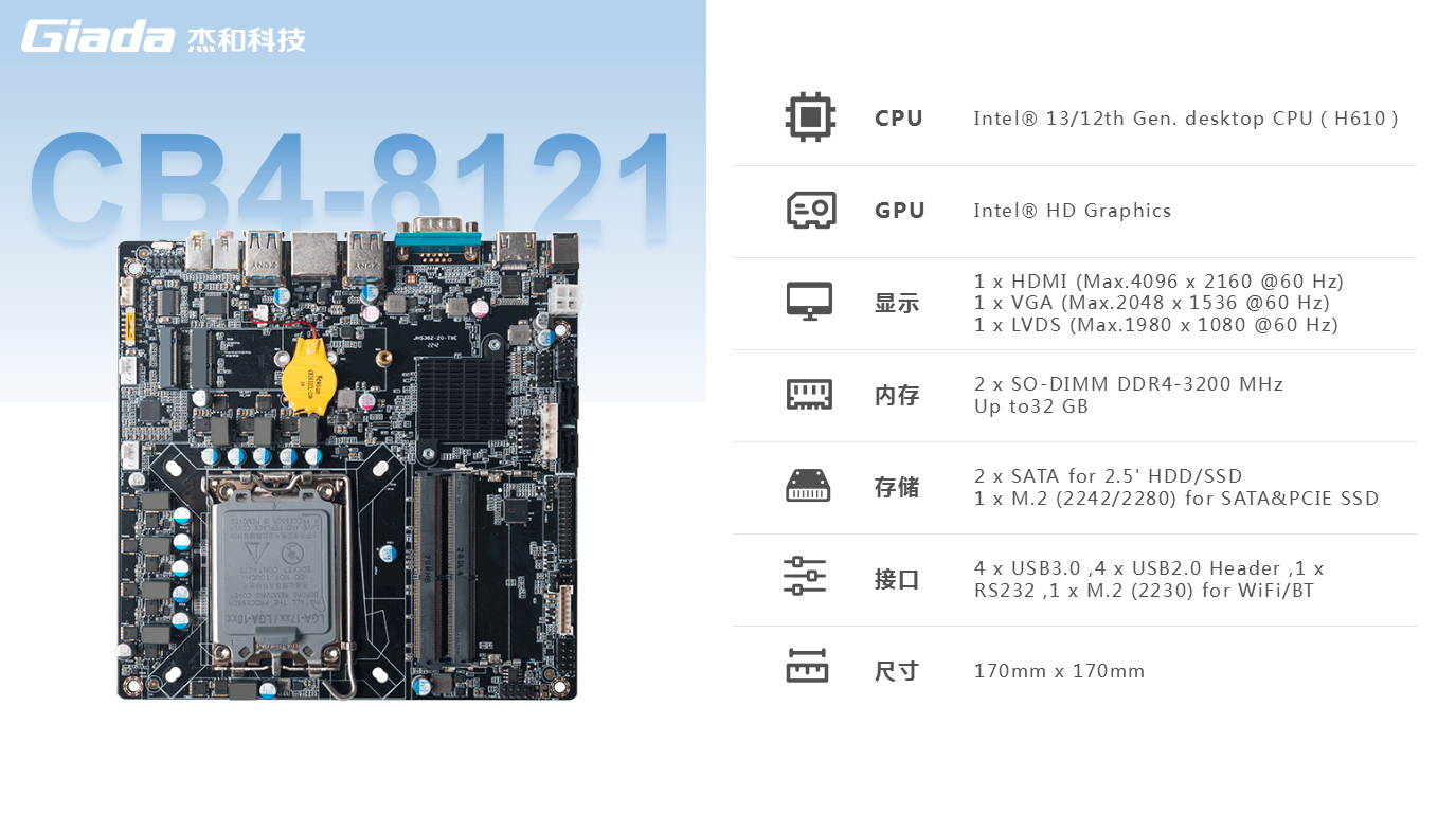 另外,一体机相对于传统的电脑更加美观,更加节能环保,而且一体机在使用体验方面也有独特的优势:比笔记本屏幕大,比台式机更简洁,也解决了一直为人诟病的台式机线缆多而杂的问题,因此,越来越多的教育办公、日常娱乐和学习的用户选择使用一体机。Giada球盟会·QMH科技根据市场与客户需求,推出这款高性能的一体机专研主板CB4-8121,带来全新震撼体验。球盟会·QMH科技主板CB4-8121是基于Thinmini ITX一体机标准设计,采用Intel Alder Lake-S平台H610芯片组,支持全新第13/12代Core i7/i5/i3处理器,搭载双通道SO-DIMM DDR4-3200MHz内存、1 x M-Key M.2 (2242/2280) SSD和 2 x SATAIII存储,强大的配置能够为用户带来出色的计算和图形处理性能,无论是载入游戏、数据传输还是平面设计,赋予用户更加极致流畅的使用体验。
