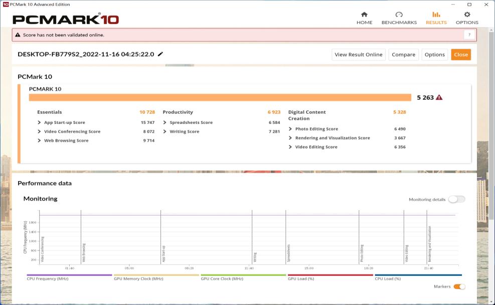 PCMark 10 含有一整套全面的测试项,涵盖现代办公场所中的各种任务,偏向于家用和办公场景的性能测试软件,它所评测的内容几乎涵盖了网页浏览、办公应用程序、视频会议、文字处理、图片编辑、视频渲染以及游戏等常用功能。通过实测,我们可以看出,综合得分综合得分为10728、生产力得分为6923,数字内容创作为5328,这些数据表明,我们同时运营十多个程序也都是不卡顿的,跑分数据符合预期。