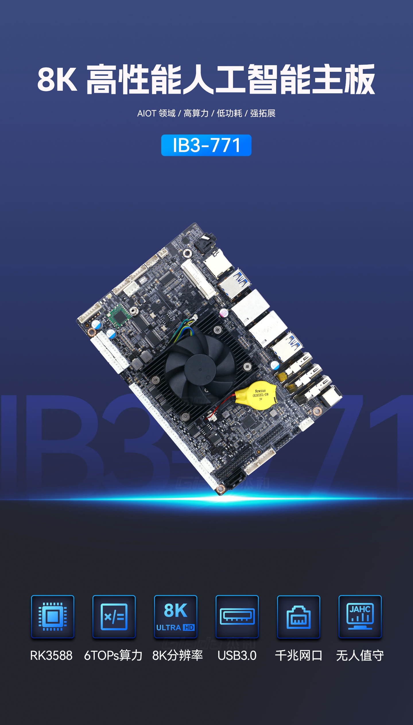 球盟会·QMH科技IB3-771采用瑞芯微全新旗舰级芯片RK3588,搭载八核64位处理器,集成ARM Mali-G610 MP4 GPU,高算力、低功耗、具备强大的视觉处理能力;性能强悍的RK3588内置AI加速NPU,提供6TOPs算力,支持主流深度学习框架,为各类AIoT应用场景提供更优的性能表现。