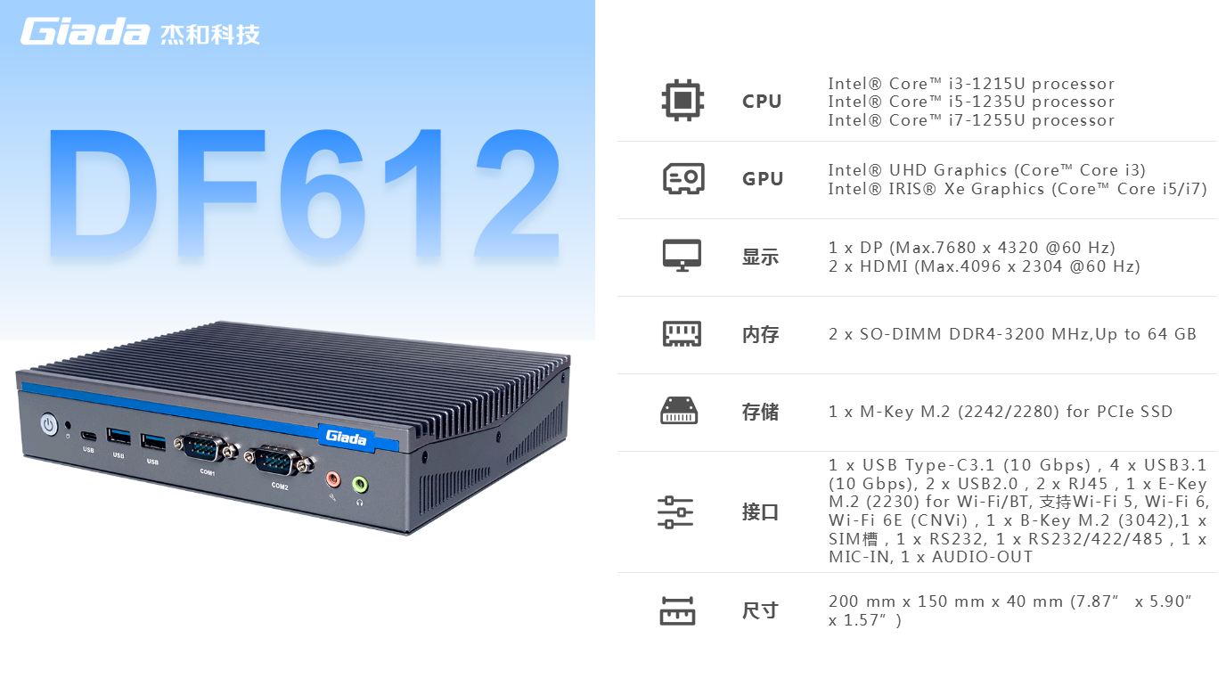 球盟会·QMH科技,商用显示硬件解决方案领导者,深耕商业显示领域24年,业务遍布欧洲,美洲,东南亚和南非等60多个国家,服务超过3000名客户,自有品牌 Giada 已成为欧洲数字标牌媒体播控器的领导品牌。在DF系列产品中,DF612作为一款全新的嵌入式计算机,搭载英特尔第12代Alder Lake处理器,具有突破性的技术、增强的图形处理能力和丰富的I/O接口,广泛应用于商业显示、智能车载、安防领域和边缘人工智能等场景。