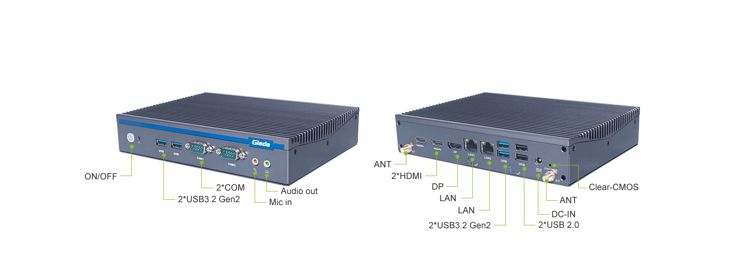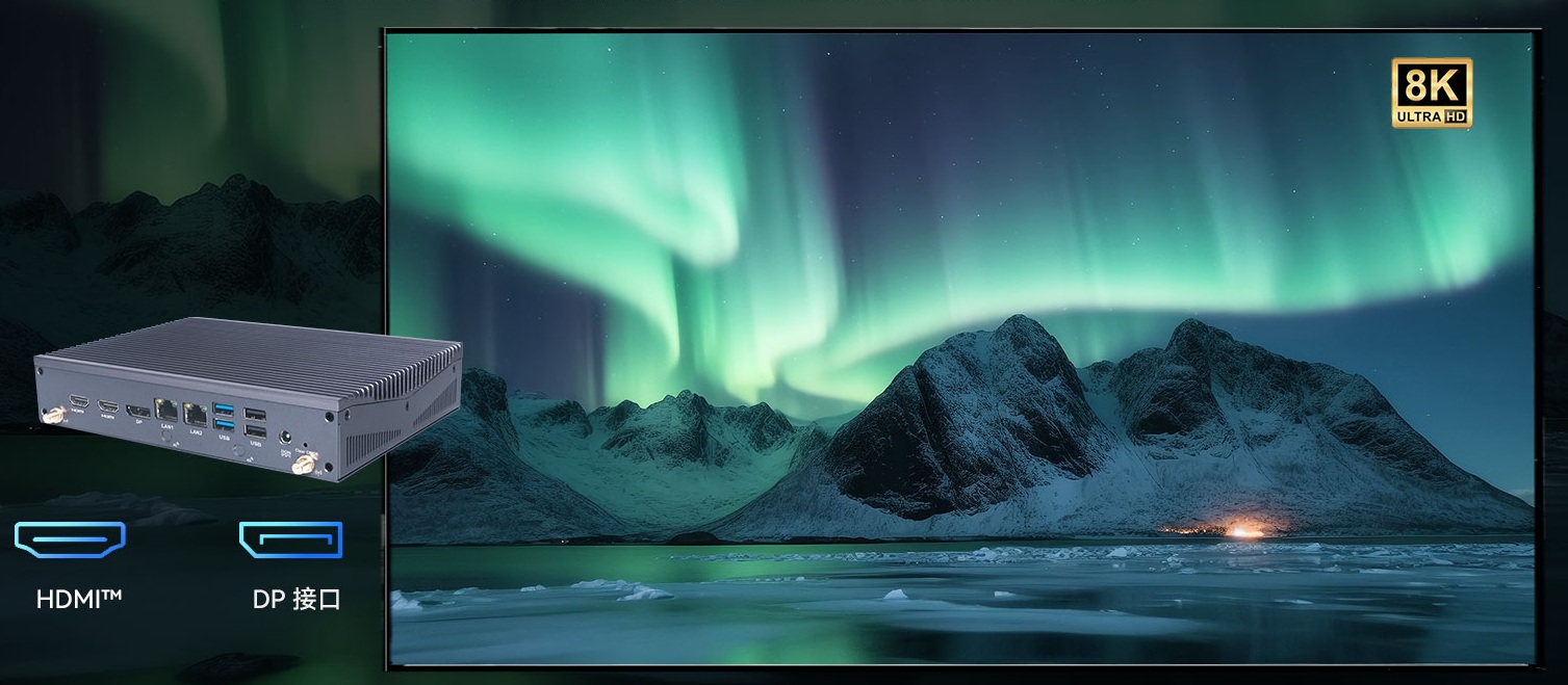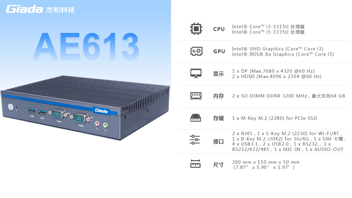 球盟会·QMH科技AE613支持Windows 11 (64bit) /Linux Ubuntu (64bit)系统,双千兆自适应RJ45网口,4 x USB3.1 (10 Gbps),2 x USB2.0,1 x RS232,,1 x RS232/422/485,1 x MIC-IN,1 x AUDIO-OUT,丰富的I/O功能接口,实现更多功能扩展。