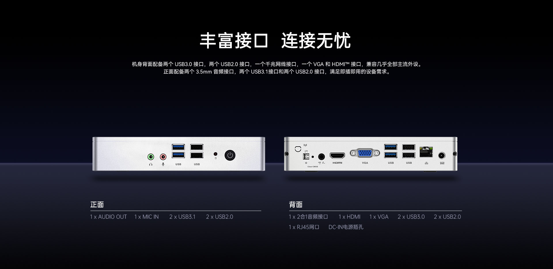 音频接口 1 x AUDIO OUT,1 x MIC IN,1 x 2合1音频接口(后置)